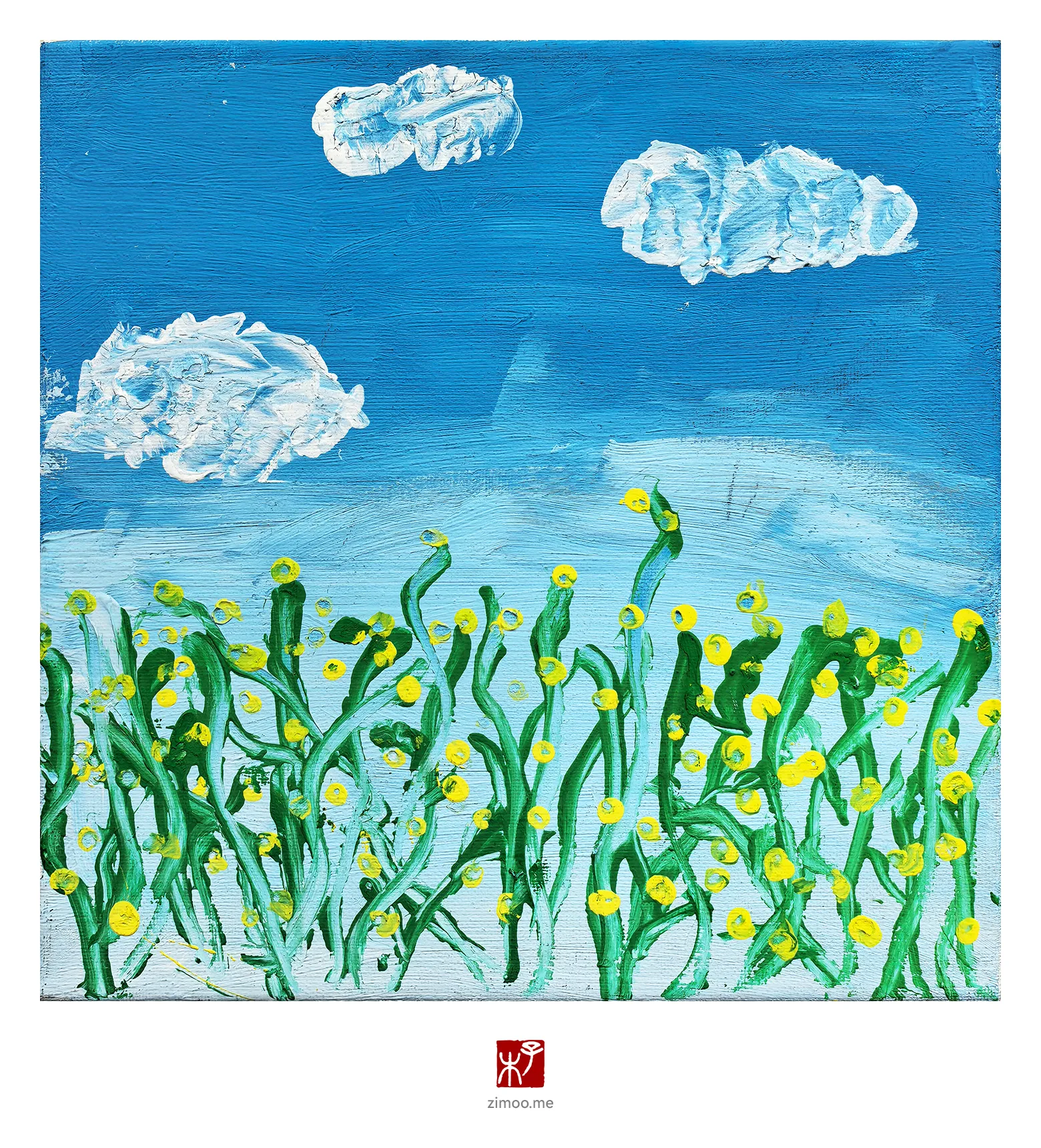 儿子的写生作品——水粉颜料画,在春天去看油菜花。